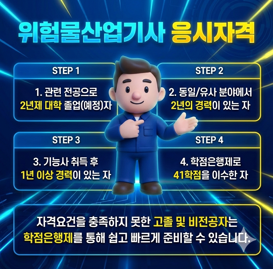 - 📌 고졸자 → 위험물산업기사: 41학점 이수 시 응시자격 충족 (평균 4개월~8개월)